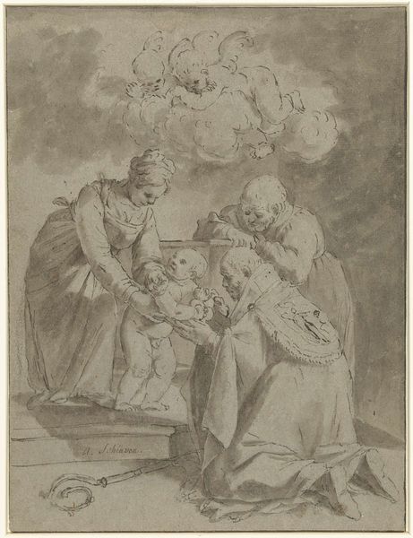 This drawing, "Holy Family with Elizabeth and John the Baptist," was created by Paulus Willemsz. van Vianen, a Dutch artist who lived through the tumultuous years of the late 16th and early 17th centuries. During this time, religious and political tensions were high. Van Vianen was a Protestant, and his life was marked by migrations as he sought refuge from religious persecution. The work offers a glimpse into the artist's negotiation of faith and identity amidst the religious conflicts of his time. Consider how the drawing might have served as a personal expression of faith. The intimate scene, rendered in delicate strokes, portrays the Virgin Mary, Joseph, Elizabeth, and the young John the Baptist. Note the humanity in the figures' faces, their quiet interactions, and the sense of familial connection. It is a gentle reminder of the importance of family and community in times of upheaval. This drawing serves as both a reflection of Van Vianen's personal experiences and a meditation on universal themes of faith, family, and resilience.