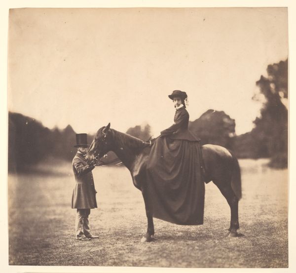 Curator: Jean Baptiste Oscar Mallitte’s photograph, titled *Lady Canning on her Black Arab and Lord Clyde, Commander in Chief*, captured between 1858 and 1861, presents a fascinating study in contrasts. The print, a marvel of early photographic technique, immediately suggests ideas about gender and power, no? Editor: It strikes me as an exceptionally balanced, yet unsettling image. There's a stillness, a quiet grandeur but the mood seems vaguely melancholic like it is somehow drained of vibrant energy despite the bright landscape depicted behind them. Curator: The composition itself, with Lady Canning elevated on her striking black horse and flanked by the two men, creates a distinct visual hierarchy. Lady Canning's silhouette against the landscape evokes an almost mythic presence. Furthermore, the monochromatic tones contribute a certain timelessness to the narrative captured. Editor: And what a strange narrative it hints at. The theatrical poses against what appears to be some military encampment and Lord Clyde practically lurking, almost obscured, adds a palpable layer of intrigue. The landscape itself almost suggests a stage. Is there an undercurrent of tension between these figures? I almost feel as if something else is suggested other than their actual status in this image. Curator: Certainly. The juxtaposition of Lady Canning's refined attire and the military setting infuses the scene with considerable complexity. Notice the almost rigid geometry of the tents juxtaposed to the free-flowing design of the dress Lady Canning is wearing. Such contrasts and tensions between civilization and the campaign field are crucial in decoding its intended message. Editor: Yes, absolutely. And consider how the sepia tone, almost uniform across the frame, almost softens any possible drama or conflict into this nostalgic tableau. There’s something about the lack of vividness that ironically underscores its artificiality. As though, it seems constructed more than a fleeting snapshot of historical significance. It seems highly contrived to elicit a response that the audience would admire in that time, a symbol that resonates into a more current significance. Curator: Precisely! Mallitte’s masterful use of light and shadow, tone and arrangement offers a powerful meditation on status, control, and representation. These photographic compositions, are never just documents, they are carefully curated statements that offer avenues to unpack societal undercurrents in times of enormous significance and impact on Victorian Society. Editor: Exactly. I think by engaging with both the formal structures of the image as well as the contextual narrative, it makes us appreciate its power far more now than if we had simply viewed this moment without analyzing and giving credence to its implied complexity. It provides a lens through which we are offered a complex and curated historical perspective.