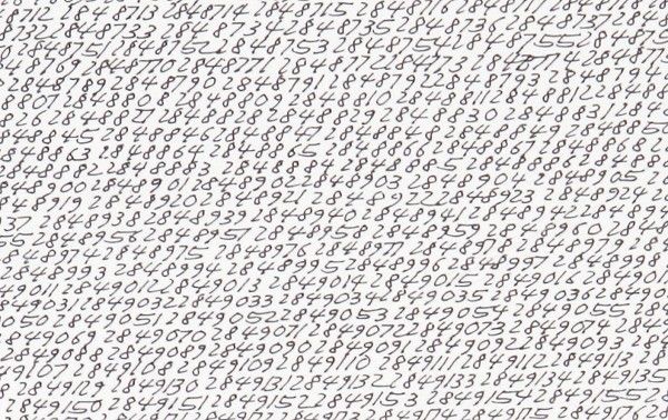 Editor: Here we have "1965/1 - ∞, Detail 511130-512739" by Roman Opalka, made using ink on paper. It’s a densely packed field of numbers that seem to stretch on forever, giving the overall impression of endless repetition. What do you see when you look at this, and how do you interpret it? Curator: Formally, this work compels a certain kind of engagement through its sheer visual density. The minute variations in the application of ink on paper, in the shape of each number, disrupt any sense of monotony. Notice the subtle shifts in tone; areas appear darker, suggesting a build-up of layered marks, and lighter where the paper remains more visible. Does that draw your eye? Editor: It does! It almost feels like a topographical map, with darker areas resembling peaks. Is this layering intentional, perhaps an evolving process visible on the surface? Curator: Precisely. The 'how' is intrinsic to the meaning. This work transcends simple representation by focusing on the durational process of its own creation. How does this commitment to the execution of the work itself influence its interpretation? Editor: It makes me think about the physical act of creating, the artist’s endurance, and maybe even the nature of time itself, visualized through repetitive action. Curator: An insightful point. The systematic and sustained process converts mere numerals into the physical realization of the work. This makes me think about temporality through materiality. Now I am interested in how we understand infinity made palpable through formal means. Editor: I learned how crucial it is to consider the artwork as both object and process. Thank you. Curator: Likewise. By questioning and engaging in dialogue we gain profound insight into art.