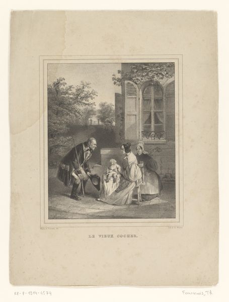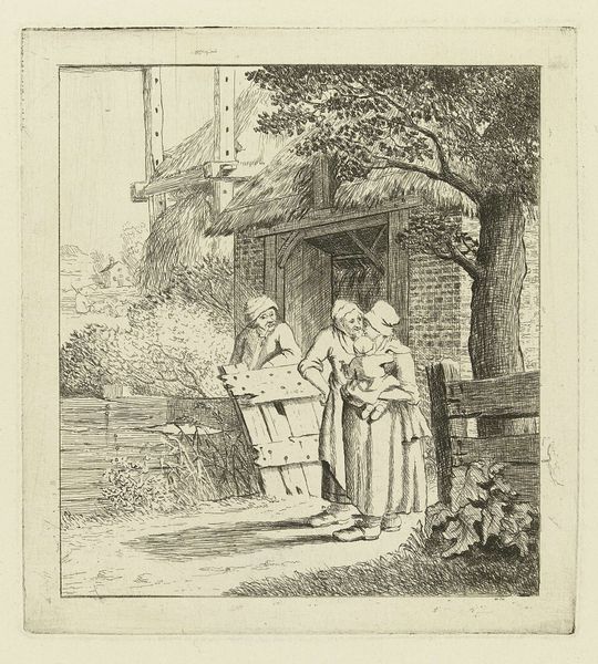 Curator: This is an engraving titled "Three Children at Their Mother’s Grave," thought to have been created between 1830 and 1877, and attributed to Leopold Beyer. It captures a very particular mood, wouldn't you agree? Editor: Utterly melancholic, but there’s a strange sweetness to it. They're holding hands, these children. Almost like they're protecting each other, or trying to, anyway. The stark contrast in light creates a dramatic focal point on their figures amidst the gloomy background. What symbols stand out to you here? Curator: The weeping willow, of course. Its cascading branches traditionally represent grief and mourning. The roses blooming near the grave may signify love and remembrance, defying death. Then, the church spire is just visible through the foliage; it certainly hints at solace and faith, a beacon of hope in the distance. I'm very struck by how Romantic Era aesthetics use landscape to evoke deep emotional responses. Editor: It makes you wonder what their mother was like, doesn’t it? Did she tend those roses herself? And that church looks almost protective looming over them. Although, those children are very primly dressed in their Sunday best, as though they were brought here, you know, not really reckoning with the space on their own terms. What sort of societal scripts were at play then, I wonder? Curator: Exactly, there is also a sense of idealization in this portrayal. Deathbed scenes, particularly those of women, became increasingly popular during this era. Representing them offered artists to showcase vulnerability but within strict moral and sentimental confines. Images like these reinforced concepts of virtue and domesticity associated with motherhood. The symbol is a constant reinforcement of ideals, not a representation of lived lives, I sometimes think. Editor: I hear that, and at the same time, can’t help imagining this particular little troupe wandering off after and finding some mischief, whispering jokes about how somber everything is and just being, you know, alive, right there, beside the great unknown. Curator: Well, that contrast does give us much to ponder. Thank you for sharing that evocative image, a space for mourning, a space for continued life, they are so inextricably intertwined! Editor: Yes, the children embody grief while being signs of continuous life, like little tenacious weeds growing right through concrete. A powerful and memorable scene.