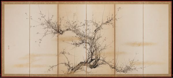 In East Asia, pine, bamboo, and plum are known as the “three friends of winter.” In addition to their individual auspicious connotations—chaste pine, upright bamboo, and pure plum—each of these three plants is also celebrated for remaining vigorous even during winter and adding color to an otherwise lifeless landscape. They thus represent the Confucian ideal of tenacity in spite of adversity. Yamamoto Baiitsu’s paintings show his familiarity with the colorful, detailed mode of bird-and-flower painting popularized by Shen Nanpin (1682–1758), an influential Chinese painter briefly active in Japan. In this pair of screens, decorative qualities are balanced with a sense of order and clarity: the rough bark of the plum provides a textural foil to the blossoms, while the arching form of the pine is mirrored in the flow of the stream.