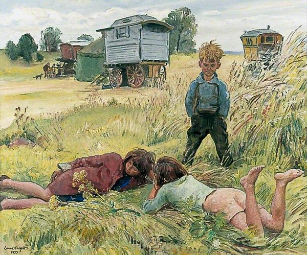Vladimir Makovsky painted "Boys in the Field" using oil on canvas, though the exact date remains unknown. It portrays two young boys in a verdant field under a bright sky, a seemingly simple scene, yet rich with social commentary relevant to late 19th century Russia. Makovsky was part of the Peredvizhniki movement, or "Wanderers," who sought to depict the everyday lives of the Russian people, often highlighting social inequalities. The children here, possibly peasant boys, are taking a break from their labor, evidenced by the bucket and stumps nearby. Their rest is not one of leisure but a brief respite from the hardships of rural life. Makovsky's decision to portray these children humanizes them, challenging the indifference often shown towards the peasantry by the upper classes. To truly understand this artwork, scholars might consult historical records of peasant life, studies of the Peredvizhniki movement, and analyses of Russian social structures of the time. The painting's meaning is contingent on grasping the social and institutional context in which it was created.