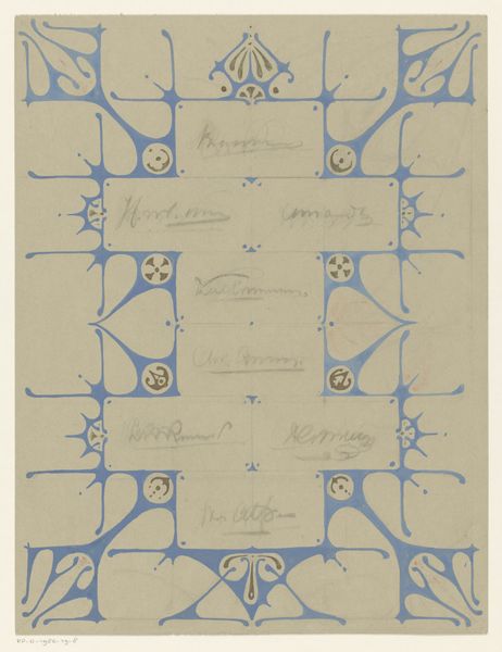 Editor: This is “Decoratief ontwerp” by Carel Adolph Lion Cachet, probably created sometime between 1874 and 1945. It's a drawing in watercolor on paper and it strikes me as intentionally unfinished, like we're looking at the blueprint for something larger. What can you tell me about it? Curator: You’ve touched on an important point. This work offers a glimpse into the design process itself. Note the grid. Cachet seems less concerned with creating a finalized aesthetic object and more with meticulously mapping out a repeating decorative motif. This reveals a shift in how we view art's purpose within the broader social structure of the time. Instead of high art, meant only for wealthy patrons, you now see artists creating designs intended for wider, possibly even mass production. Where might we expect to find this pattern? Editor: Perhaps wallpaper or some sort of textile? Something functional rather than purely aesthetic? Curator: Precisely. Now consider this: How does the “unfinished” nature, the very display of the working grid, potentially influence how the *public* views the role of the artist? Does it demystify the creative process? Editor: It does. It almost makes it seem like anyone could reproduce this pattern, democratizing design, perhaps? I hadn't considered the power dynamics at play here, the role of design and production itself. Curator: Exactly! It's not merely a pretty design, but a document of the changing role of art in society, reflective of burgeoning industrialization. Looking closely reveals so much more than simply meets the eye, wouldn't you agree? Editor: Absolutely. I will never look at decorative arts the same way.