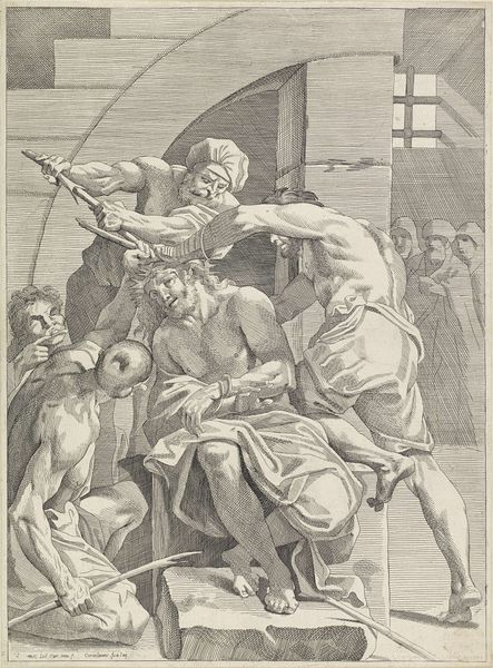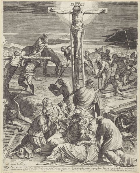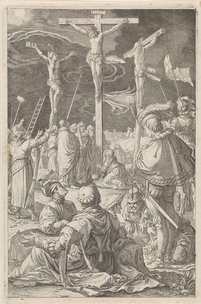 Curator: Here we have an engraving dating from 1615 to 1650, titled "Kruisdraging" which translates to "The Carrying of the Cross." Editor: Immediately, the thing that strikes me is the overwhelming density of bodies in the scene. You feel the crush of the crowd. And that steely texture achieved solely through the engraver's hand is astonishing. Curator: Absolutely. This piece depicts the moment Christ is forced to carry the cross. Note the expressions on the faces. The pity is starkly visible amidst the aggression and the sheer labor that defines this scene. We can look through the lens of postcolonial theory and think about this work within historical patterns of domination. What does the labour and the emotional performance in this work say about power structures? Editor: Right, but even the power dynamics are inscribed within the materiality itself. It’s a print. Meant to be reproduced and disseminated. We must acknowledge its function in shaping public consciousness. Curator: The act of witnessing becomes essential. Consider, too, the visual language. The upward gaze toward Calvary underscores a narrative about sacrificial embodiment, drawing parallels with contemporary discourse on gender and self-determination, especially in terms of navigating both corporeal and political landscapes. Editor: Indeed, the social history of reproductive technologies can provide greater insights when thinking about print production and accessibility. We see engravings of this time travelling far and wide. The artwork could operate as a powerful tool to cement social norms, reinforce religious ideals, or question established systems. Curator: Its layered narratives reveal much about its socio-political contexts. Viewing the historical significance within contemporary debates gives us an invitation for an interdisciplinary conversation, prompting fresh and engaging understandings about historical art. Editor: Precisely, looking closer, tracing those lines... the weight of the wood and ink that carry those ideas to us, is what anchors our contemporary world to this past.