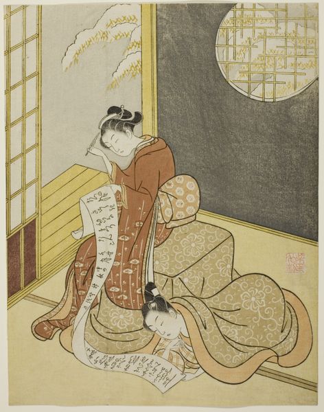 Curator: This exquisite woodblock print, "Returning Sails at Shinagawa," comes to us from Suzuki Harunobu's "Eight Fashionable Views of Edo," dating from around 1768 to 1769. It's truly breathtaking. Editor: Yes, those muted colors just radiate tranquility! And the sheer flat expanse of the bay visible through the latticed window – it's so still and serene, like a little paper theatre of daily life. Curator: Harunobu, with his ukiyo-e sensibilities, invites us into this intimate scene. You notice, don't you, how the interior and exterior spaces are seamlessly connected, blending personal narrative with landscape? There are two women in what might be a tea room—and is that a small dog looking out towards the sea? Editor: Right, there's labor in the foreground here. The production of textiles and even just making tea were activities with very material underpinnings. The soft hues do little to veil the commodification that sits behind all the objects—the silks, the tea—that the figures enjoy. What was the work process to produce these woodblock prints at this time? Curator: A real dance of labor, actually! A publisher commissioned the artist, in this case Harunobu, who'd then create a design. This would be handed over to a block cutter to carve the image into woodblocks—one block for each color. And then a printer would apply ink to these blocks and press them onto paper. This piece, because of its subtle hues and the complexity of layering colors, must have taken exceptionally skilled hands. Editor: Absolutely! It brings a renewed understanding of production as it exists beyond singular genius, an approach too commonly imposed onto aesthetic value. The layered production and material implications involved give the piece another layer to appreciate. Curator: In fact, this makes me reflect on Shinagawa itself, during that era, as both a literal and imaginative space. For me, Shinagawa becomes this transitional zone, blurring the lines between reality and reflection, haven and horizon, work and dream. What a window! Editor: Agreed. In this regard, Harunobu allows us to appreciate, even celebrate, all those unglamorous transactions and labor that built these 'views' that otherwise just feel effortless and floaty, like returning sails.
