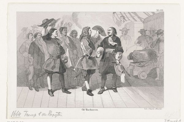 Editor: So, this is an engraving titled "Overgave van De Winter na de verloren zeeslag bij Kamperduin, 1797," dating from 1853-1861, housed in the Rijksmuseum. It depicts a naval surrender, and it feels surprisingly restrained, almost formal. What do you see in this piece beyond just the historical record? Curator: I see a potent visual representation of power dynamics and the construction of national narratives. Consider the moment captured: the Dutch admiral De Winter surrendering his sword after defeat. How does the artist frame this event to shape public perception? Notice the clear distinction in posture and attire between the victors and the vanquished. Who do you think the artist is trying to empower in the image? Editor: Well, clearly the British. They stand tall, looking confident, while De Winter seems… defeated, obviously, but also somewhat dignified. Is it fair to say this is propaganda, then? Curator: It's more complex than simple propaganda. It is creating and reinforcing an idealogical view on who has power. Ask yourself, what does this scene omit? What stories are silenced? Think about the social costs of war, the impact on ordinary citizens, and the narratives of resistance that might exist outside the frame. Is it not an elegy of sorts? How do national identities play a role? Editor: That's a really good point. We only see the officers, the supposed heroes. And the engraving reinforces that hierarchical structure, doesn’t it? Is there something else we might miss if we just focus on the central event? Curator: The context of 19th-century printmaking is key. These images were widely circulated, shaping popular understandings of history. Considering that this print comes decades after the event, who was the intended audience, and what political climate might have influenced its creation and interpretation? Editor: I guess it made the victory seem cleaner and more decisive than it might have been in reality, constructing this sense of British authority in the North Sea. Thanks. That perspective really broadens my understanding. Curator: Indeed, viewing art through a lens of power and representation, and the many untold stories within art, is not simply about the visual aesthetics or the artist's intention but understanding it in relation to the sociopolitical conditions from which they arose.