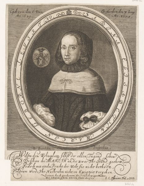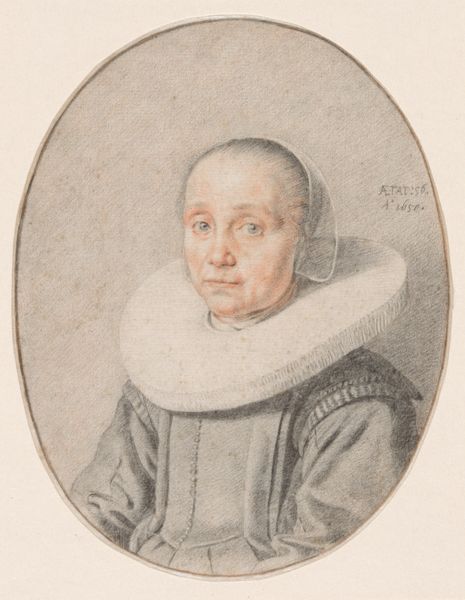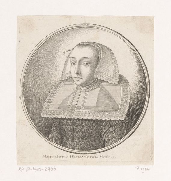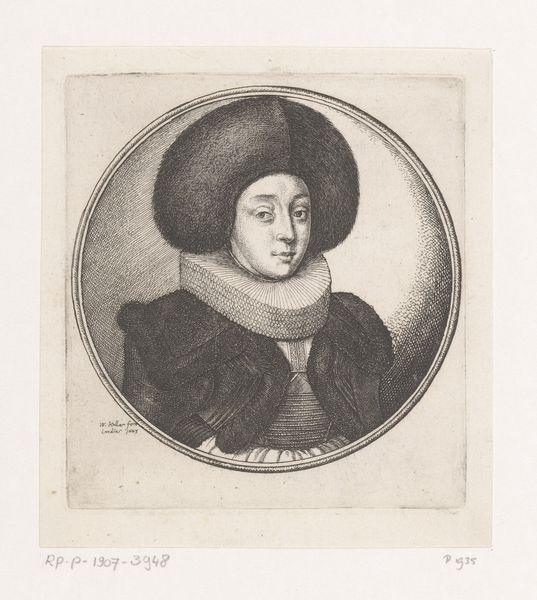 Wenceslaus Hollar created this small etching of a woman with a ruff collar in 1644. The composition is immediately striking due to the figure being framed within a circle, which softens the formality often associated with portraiture. Hollar masterfully employs line and texture to define form; the intricate, radiating lines of the ruff collar contrast with the smoother, more subtly shaded face. The gaze of the subject meets ours directly, creating an intimate connection despite the historical distance. The ruff collar itself is a fascinating structure, a semiotic symbol of status. Hollar's detailed depiction invites us to consider how such attire both constructs and constrains identity. The careful balance between detail and simplicity destabilizes a fixed, straightforward interpretation, allowing for an appreciation of both its aesthetic qualities and its cultural implications.