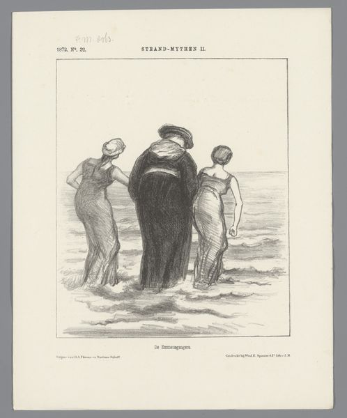 Editor: This is plate 2 from "Croquis Aquatiques" by Honoré Daumier, made in 1854. It’s a lithograph on paper, and it immediately strikes me as satirical. The figures are drawn with such exaggeration. What do you make of it? Curator: Daumier truly understood how to use visual cues to communicate complex ideas about human nature. Here, the text underscores the image: "dignity alone distinguishes man from the rest of the animals.” This idea of 'dignity' as performative and perhaps even absurd is highlighted by the visual language – the characters are at the beach, likely a new leisure activity for the rising middle class. What do their clothes signify to you? Editor: Well, their swimwear seems rather formal, almost like they’re trying to maintain appearances even in a casual setting. It makes them seem even more ridiculous, really. Curator: Precisely! And this tension is central to Daumier’s commentary. Notice how he uses line and form. Exaggerated features, like Madame Prudhomme's bulging physique and Monsieur Prudhomme's stance, reveal anxieties surrounding social status. It’s as if Daumier is asking: How do we cling to our self-image of dignity even when indulging in leisure? Does that dignity appear naturally, or does it turn into a funny masquerade? Editor: That’s a great point. I didn't really consider the context of the rising middle class and anxieties around maintaining appearances. Curator: And think about where this was published - likely a widely-circulated journal. Daumier was engaging in a conversation with the public about these evolving social dynamics, inviting viewers to reflect on their own behaviors and perceptions of 'dignity.' He saw through the masks. Editor: This has definitely changed how I see Daumier's work. It’s not just caricature; it’s a form of social commentary. Curator: Indeed. The power of the image lies in its ability to encapsulate and critique entire cultural landscapes, and Daumier was a master of that art.