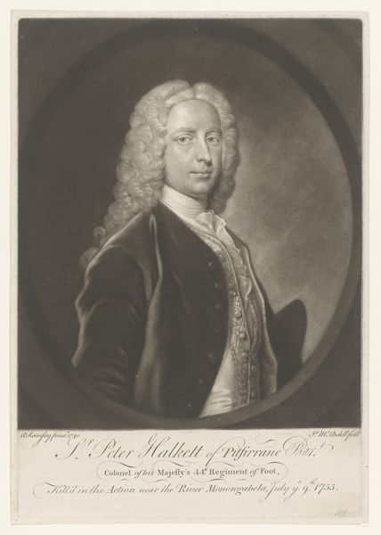 Curator: This engraving, titled "Portret van John Coutts," dates back to between 1751 and 1753. It's by James McArdell and currently resides here at the Rijksmuseum. An intriguing portrait of a prominent figure of his time, I must say. Editor: The immediate feeling is one of measured authority, wouldn't you agree? His gaze is direct, almost penetrating. It gives you the sense of a person used to being listened to. Curator: Indeed. The portrait captures John Coutts, who was the Lord Provost, or Mayor, of Edinburgh. It reflects the increasing importance of civic leadership during the Enlightenment. Portraits like these cemented public perception of power and influence within local governance. Editor: That elaborate wig is a fantastic status symbol too. Not to mention the details in the coat buttons and fabric, each meticulously rendered. The clothing itself serves as an outward signifier of class, education, and good standing within his community. Are there hidden meanings there as well? Curator: It’s interesting to note the history of printmaking in the Netherlands as it democratized images. Engravings allowed portraits to be circulated more widely. McArdell skillfully reproduced Ramsay's original portrait for public consumption. It created a more accessible representation of civic authority. Editor: I'm thinking about the oval frame surrounding the subject. Isn’t that a familiar symbol from ancient Rome? The “imago clipeata,” it references a long line of ancestors—a distinguished past and an ambition for historical posterity. Curator: Absolutely. And look closely at the inscription. It’s not just a name; it's "Late Lord Provost of the City of Edinburgh," a deliberate act of remembering his role, securing his place in civic memory. It underscores how crucial public image was. Editor: I find myself dwelling on the contrast between the crisp details of his face and clothing and the slightly softer quality of the background. The engraver seems to invite us to consider his personal qualities against his civic functions. Curator: Which gets at how a portrait can be viewed as both an individual likeness and an expression of collective identity, serving to uphold or negotiate the dominant cultural narratives. It speaks to how we want to remember. Editor: I think, on second glance, it invites me to look more into the society, to discover the city this person served. Curator: And perhaps that is the role of a good portrait; a doorway into a richer understanding of the individual, his society and its values.