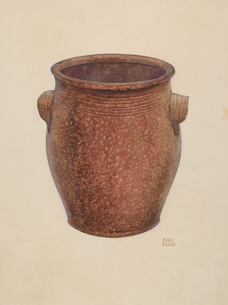 Clyde Cheney made this "Large Earthen Jar" using watercolour, but when? I love how the color is built up, layer upon layer, to create this rich, earthy tone. The paint is applied so delicately, almost like a stain, allowing the paper's surface to breathe underneath. It's fascinating to see how Cheney captures the texture of the jar, particularly the rough patch near the bottom. It's not just about depicting the jar; it’s about evoking a feeling, a sense of the object's history and use. That lighter, almost faded section at the bottom tells a story, doesn't it? It speaks of wear and tear, of the jar's journey through time. It reminds me of Giorgio Morandi and his still life paintings with their muted palettes and simple shapes. Both artists share a similar sensibility, finding beauty in the ordinary, and inviting us to contemplate the quiet poetry of everyday objects.