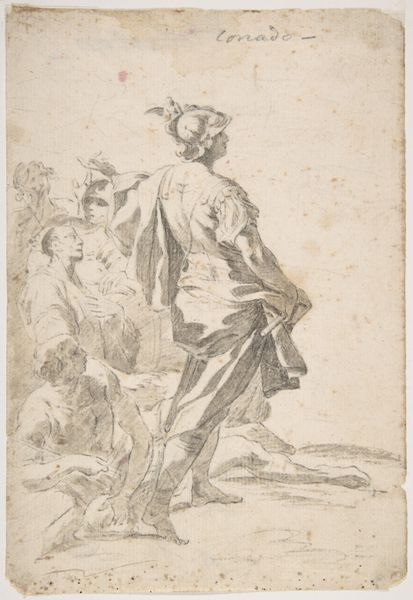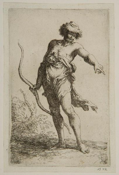 Curator: The work before us, "Beggar," etched by Christian Wilhelm Ernst Dietrich around 1764, presents an intriguing figure. Editor: There's something unnerving about this image—a stark, almost confrontational vulnerability. He appears both exposed and defiant. Curator: Indeed, the beggar, sketched with such directness, invites reflection on societal hierarchies of 18th century Europe. How did such a portrayal challenge or reinforce those structures? Editor: The hat outstretched, the gaze directed upwards—these are age-old symbols of supplication, ingrained deeply in our collective visual memory. Curator: I agree. The etching itself, with its quick, restless lines, might symbolize the instability inherent in the beggar's very existence. Editor: It's a stark reminder that images persist, and with them, the stories—and often the inequalities—they represent. Curator: Absolutely. It forces us to confront uncomfortable truths about poverty and representation. Editor: A brief yet powerful glimpse into humanity's complex relationship with itself.