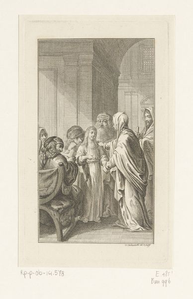 Editor: Here we have Daniel Chodowiecki’s "Merope roept het volk en de priesters op tot een eerlijk proces voor Aegisth", an engraving from 1787. The detail achieved through line alone is remarkable! I'm also intrigued by the implied narrative. How do you interpret this work? Curator: From a materialist perspective, it's vital to understand that printmaking in the 18th century was intrinsically linked to the circulation of ideas and social commentary. Chodowiecki, through this engraving, participates in the broader Enlightenment discourse about justice, governance, and the role of the public. Notice the stark lines, almost mass-produced, highlighting accessibility for wider distribution and engagement. Editor: That's a great point about accessibility. So, it's less about the artistic genius of Chodowiecki and more about the function of the print within society? Curator: Precisely! We consider not only the final product but also the labor involved in its creation: the engraver's skill, the publisher's intent, and, most importantly, the consumption by its audience. How would you consider the act of "reading" or interpreting this print to be a form of consumption in its own right? Editor: I suppose it transforms information into a sort of…intellectual property for the viewer? Curator: Indeed. Consider then, how the artist's choices of subject, composition, and line weight affect not just its aesthetic appeal but also how people perceive, understand, and perhaps even challenge established social structures. This engraving is more than an image, it's a materialized argument! Editor: That reframes the whole image. Thinking about it as part of the larger publishing and distribution industry highlights how the artist contributed to broader public conversations, making history more relatable. Thanks!