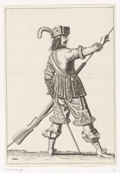 This engraving of a soldier holding a musket rod was made around 1645 by Petrus Rucholle. Printed from a metal plate, likely copper, using the intaglio process, the design is incised into the surface, filled with ink, and then transferred to paper under high pressure. Notice how Rucholle’s skillful manipulation of the burin creates a range of tonal effects, from the dense, dark lines that define the soldier's figure to the delicate, light hatching that suggests the texture of his clothing and feathered hat. This wasn’t just about artistic skill, though. It was about the business of image-making, and the technologies of reproduction that were rapidly evolving at this time. The print medium itself speaks to broader social issues of labor, politics, and consumption. Consider the labor involved in producing the print, from the mining of the metal to the skilled craftsmanship of the engraver and the operation of the printing press. These are all part of the story this image tells. By considering the materials, making, and context, we can gain a deeper understanding of the artwork's full meaning, challenging traditional distinctions between fine art and craft.