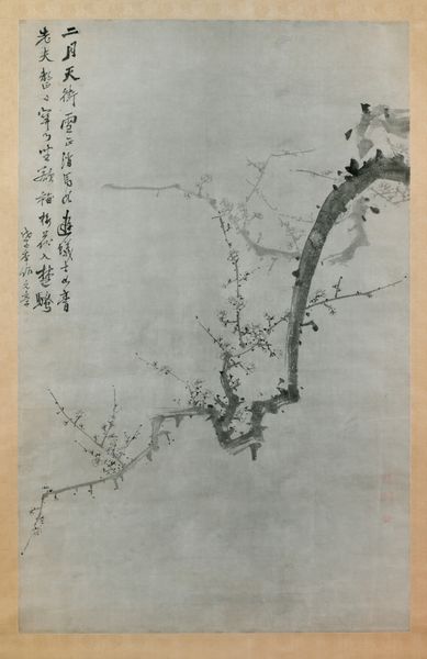 Editor: Here we have "Drenched in Moonlight," a watercolor painting, created sometime between 1721 and 1799. It's giving me serious contemplative vibes, like a quiet moment in nature amplified by moonlight. I wonder, what catches your eye in this work? Curator: Well, aren’t we all drenched in moonlight, metaphorically speaking? It makes you think about ephemeral beauty, doesn't it? It feels like a love letter to a fleeting moment. Note how the artist captured the essence of the scene with the delicate brushwork, rendering a misty, almost dreamlike quality. Are you sensing a balance of presence and absence here? Editor: Absolutely, the transparency makes the moon feel almost ethereal. Is there any symbolism going on that maybe I’m missing? Curator: Definitely! Plum blossoms, often depicted in East Asian art, symbolize perseverance, hope, and beauty amidst hardship. See how they bloom even in the cold of winter? But consider the empty space, too; that’s just as important! In East Asian art, it's pregnant with meaning. Editor: Meaning like...? Curator: Perhaps the vastness of the universe or the endless possibilities of life, a sort of “art is what you bring to it” invitation, which really echoes the artist’s own intuition. It’s both visually pleasing *and* thought-provoking. Don’t you think? Editor: Totally! It’s cool to think this delicate little painting is holding so much space—emotionally and conceptually. It almost feels like a prompt to find the hope and resilience blooming within me, drenched in my own kind of metaphorical moonlight, as you mentioned. Curator: Yes, that’s just it. "Drenched in Moonlight" is as much about what we *see* as what we *feel.* The artist invites us on a journey, using nature as a mirror reflecting our own interiority.