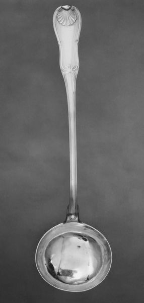 Editor: Here we have a serving spoon crafted in silver, dating back to around 1784-1785, made by Jean-Etienne Langlois. Its sleekness almost contradicts its ornate detailing at the tip. What does this object tell us, beyond just its functional purpose? Curator: This spoon speaks volumes about the social and cultural landscape of its time. In late 18th century France, even utilitarian objects became canvases for expressing wealth and status. The Baroque style, though nearing its end, still held sway in decorative arts. Consider how this spoon, likely used by the aristocracy, reflects their values of refinement and elaborate display, even in the most private settings. Do you think it's naive to assign this kind of symbolic value to silverware? Editor: No, not at all. It's just...a spoon! Yet it embodies an entire class structure through material and form. It makes you wonder, were these decorative objects simply tools for a certain social class to distinguish itself from the others? Curator: Precisely. Silver itself was a valuable commodity, but the intricate design and craftsmanship amplified its worth, marking it as something accessible only to the elite. We can analyze the political imagery that might have been subtly embedded in its decorative elements and also how a museum today impacts our perception of its importance. Is it displayed next to a Fabergé egg, perhaps? This elevates it even further. Editor: I see your point. Displaying it almost validates its existence beyond utility. Thanks for shedding some light on the historical and social contexts. I never would've considered the serving spoon as an actual political symbol before. Curator: That’s the beauty of studying art history. Even the simplest object can reflect complex socio-political forces. Hopefully now, spoons will never seem mundane again.