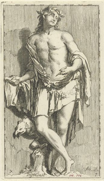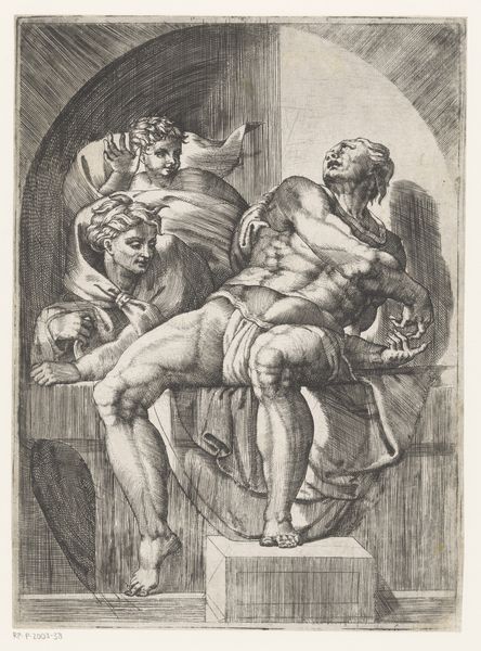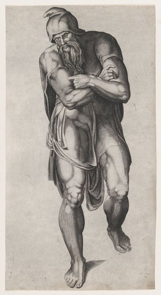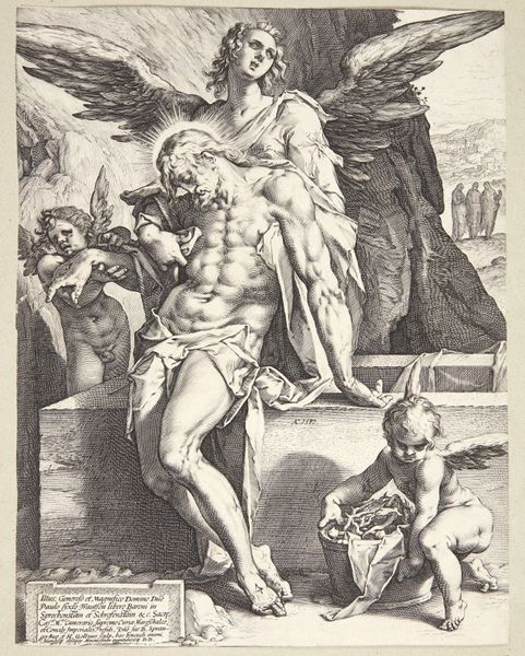 Hendrick Goltzius created this print of Pluto with ink on paper. The engraving presents a muscular, bearded figure, dramatically lit and framed within an architectural niche, evoking a powerful sense of depth and volume. The composition uses strong contrasts between light and shadow, achieved through dense, cross-hatched lines, to define Pluto’s physique and the surrounding space. Goltzius masterfully uses these formal elements to create an illusion of three-dimensionality, typical of Mannerist art. The figure's dynamic pose and the swirling drapery add a sense of movement, destabilizing the static nature of the print medium. The architectural setting, with its cherubic figures and classical motifs, serves not just as a backdrop, but as a structured contrast to Pluto's raw, untamed power. The interplay between the organic and the geometric, the fluid and the structured, highlights the inherent tension between the realms Pluto governs. This complex layering of form and content allows Goltzius to engage with philosophical ideas about power and representation.