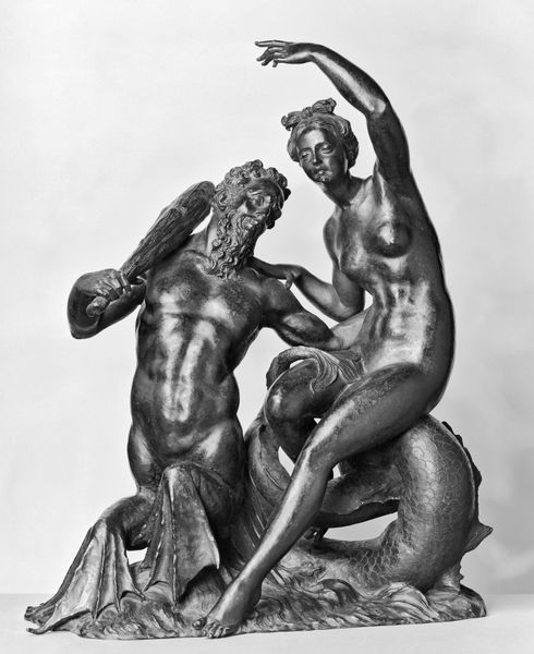 Giambologna created this bronze River God, one of a pair, sometime before his death in 1608. Its dark bronze, finely textured surface captures a muscular, reclining figure who embodies nature's raw power. The composition spirals, inviting the eye to circle around the god's twisting torso and limbs. Giambologna's work reflects the Mannerist style with its emphasis on dynamism, complex poses, and emotional expression. The figure is both idealized and naturalistic, capturing the Renaissance fascination with the human form and its ability to convey meaning. The god's relaxed yet commanding pose also hints at a broader cultural shift. The sculpture’s form echoes the philosophical currents of its time, where the classical and natural worlds intertwine. While its initial meaning may have been tied to mythology and the celebration of natural forces, its enduring presence as a work of art allows for continuous interpretations and relevance. How might its fluid lines represent both the eternal flow and changing nature of meaning itself?