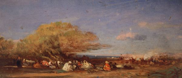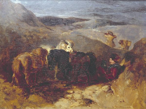Curator: Paul Falconer Poole's study, ‘Sketch for ‘The Death of Cordelia’’, presents a tragic moment in muted tones. What strikes you about this initial composition? Editor: It feels intensely somber; the figures are cloaked in shadow, which lends an air of inevitability to the scene. The earth tones reinforce the sense of finality. Curator: Absolutely. Cordelia’s death, drawn from Shakespeare’s King Lear, becomes a focal point for exploring themes of filial duty and the consequences of power dynamics. The image of the fallen daughter resonates with centuries of art depicting female suffering. Editor: Yes, and the symbolic weight of Cordelia's body as a representation of innocence betrayed cannot be ignored. That single figure becomes a vessel of morality within a corrupt world. Curator: Indeed. The sketch acts as a microcosm of societal ills, exploring themes of injustice. Editor: I am left pondering the cyclical nature of such stories, how the past continues to inform our present. Curator: A stark reminder that these narratives still resonate deeply within our collective consciousness.