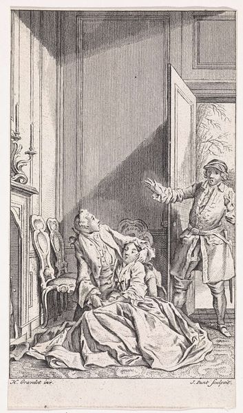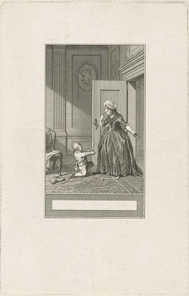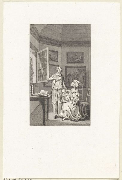 Curator: Looking at this drawing, I get this distinct sense of hushed anticipation, don't you? It’s incredibly delicate. Editor: It does, the artist who created it sometime between 1776 and 1851, Daniël (I) Veelwaard, perfectly captures that feeling of… almost being on the verge of revelation? The work is known as “Twee kinderen bij een vrouw in een interieur,” which translates to “Two children with a woman in an interior." You can find it here at the Rijksmuseum. The drawing itself, created using ink on paper, is a gorgeous example of academic art mixed with genre-painting. Curator: Absolutely, I see how the lines themselves play a symbolic role. This seemingly straightforward domestic scene evokes echoes of instruction, the mother's touch radiating from the image. And did you notice the picture hanging above, as if pointing to something? Editor: Well spotted! Yes, landscape images frequently embody aspiration. It hints at a journey. More symbolically, perhaps, to an emotional or moral journey? What does it say about our longing for freedom, juxtaposed against the ordered home? Curator: It is really lovely and intimate at the same time. A tender familial bond at play, framed in the comfort of domesticity. Like those children will carry her soft hand in her memories forever. Editor: That small detail—the way her hand rests on one child's head—acts as a symbolic weight in that case, right? A mother's blessing or, even, an expectation? Considering that these moments shape so much about how we carry ourselves into adulthood, what sort of memories or cultural symbols does Veelwaard transmit here? Curator: The light really sets the tone, too. So measured, restrained. In some way, the drawing's subtle and quiet approach reminds me of looking into someone's childhood. Editor: I like how you note that the composition, at first so simple, hints at complex symbols and unspoken meaning about expectation and the family through time, a world contained and protected, all through this modest genre scene captured in ink. Curator: Exactly! Seeing the artwork presented as an old photograph, even in monochromatic strokes, makes the entire experience profound. It really makes me think about past lives and memory! Editor: Me too! In that respect, looking through that perspective really brought me a lot closer to these long-lost lives!