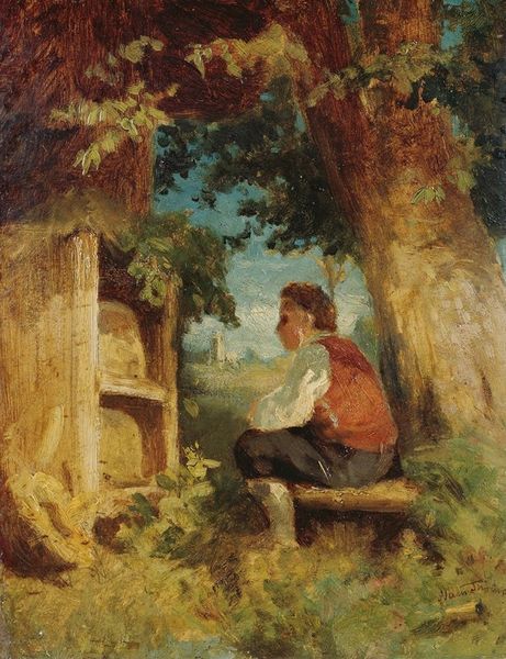Narcisse-Virgilio Diaz painted this oil on canvas, titled "Boy Fishing", sometime in the mid-19th century, reflecting the growing interest in representing everyday life. This intimate scene captures a young boy engaged in a simple, timeless activity. Diaz was associated with the Barbizon school of painters, who rejected the formal academic style, preferring instead to paint en plein air, directly from nature. This artistic choice reflected a broader shift in French society towards a more democratic view of landscape. The painting's focus on a common subject, rather than a historical or mythological scene, aligned with the era's increasing interest in the lives of ordinary people. To understand this work better, it's essential to examine exhibition records, period reviews, and the artist's biography. Through these sources, we can contextualize the painting within the social and institutional structures of the time.