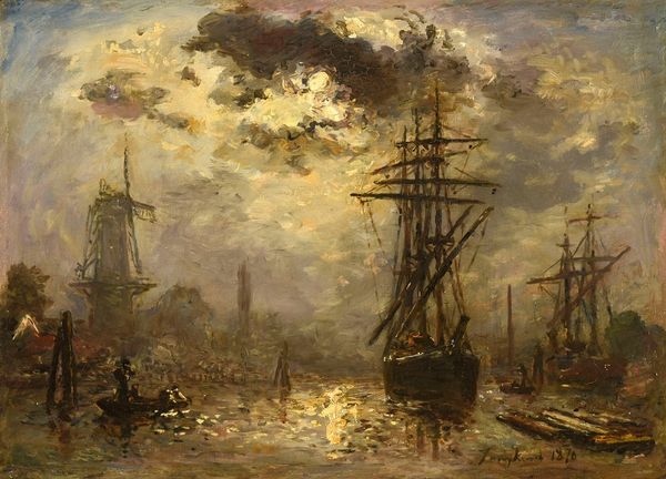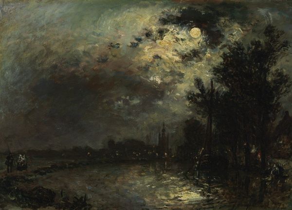 Johan Barthold Jongkind captured this evocative night scene, Clair de Lune sur un Canal, Dordrecht, using oil on canvas, during a time of significant industrial and social change in Europe. Jongkind, a Dutchman working in France, was deeply influenced by the Hague School of painting, which sought to capture the mood and atmosphere of the Dutch landscape. In this painting, the moon casts a gentle glow over the Dordrecht canal, illuminating the boats and surrounding architecture. Canals were the lifeblood of Dutch commerce and society, and the quiet stillness of the scene evokes a sense of the Netherlands' rich maritime history. Jongkind wasn't interested in documentary accuracy, but rather in conveying a feeling. Although a man, Jongkind was known for his sensitive and nuanced approach to painting, an approach that ran counter to the prevailing masculine ideals of the time. Through his emphasis on mood and atmosphere, Jongkind invites us to contemplate our own connection to the natural world and our place within it.