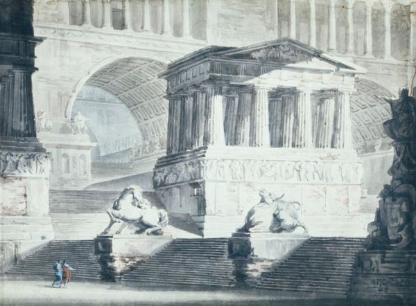 Editor: Here we have Nicolai Abildgaard’s "Pamphilius and his Servant Davus. From Terence’s Andria," painted in 1802 using oil on canvas. The neoclassical architecture dominates the scene, almost dwarfing the figures. I am drawn to the linear perspective; the receding lines and strong shadows give the composition a powerful depth. What are your initial observations? Curator: I am immediately struck by Abildgaard's calculated arrangement of forms. Consider how the orthogonal lines converge to create a sense of spatial recession. How does this calculated depth contribute to the overall reading of the narrative? Editor: It creates a stage-like space where we, the viewers, become the audience to the scene unfolding. The figures seem to perform within the architecture's rigid structure. Curator: Precisely. Note also the subdued palette. The limited range of earth tones and pale blues contributes to the work's sense of classical restraint. Abildgaard carefully modulated light and shadow to model the figures and architectural elements, further enhancing the pictorial depth and volume. Do you perceive any disharmony that could yield deeper insight? Editor: The dog at the bottom right looks rather out of place – not stylistically, but tonally it seems like a dark splash, especially near the comparatively pale staircase. Curator: An astute observation! This tension created between the light, rational architecture and the grounded darkness highlights the work’s intrinsic contrasts. Abildgaard masterfully uses these visual strategies to create a complex and compelling pictorial space. Editor: I appreciate how your focus on the formal elements really revealed the strategic, almost mathematical structure of the composition, and the tension therein. Curator: And your interpretation illuminates a dimension that goes beyond the surface aesthetics of classical order. It seems as though we have collectively decoded how the artist strategically utilizes intrinsic pictorial cues to build structural meaning in their art.