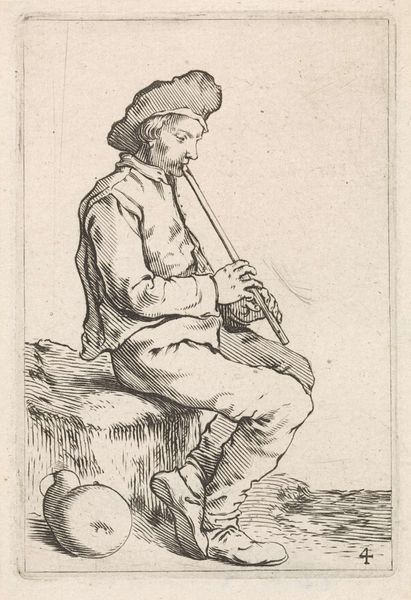 This etching by Mosè di Giosué Bianchi presents us with a bagpiper, his instrument a key symbol resonating through time. The bagpipe, with its archaic form, evokes pastoral scenes and communal festivities, deeply rooted in the cultural memory of rural life. Consider how musical instruments have consistently appeared as symbols of celebration and community across cultures. From ancient Greek aulos players depicted on vases to Renaissance paintings of lute-playing angels, music bridges the earthly and the divine. Yet, here, the bagpiper stands alone, his gaze distant, perhaps hinting at a melancholic aspect of tradition fading away. The emotional weight of the image lies in this tension: the bagpipe, a vessel of joyous sound, played by a figure seemingly lost in thought. This is the eternal recurrence of symbols, constantly reshaped by the currents of history and individual experience.