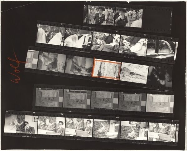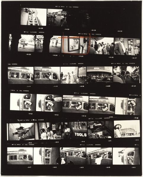 This contact sheet was created by Robert Frank, likely in the 1950s or 60s, at the Metro-Goldwyn-Mayer studio in California. It’s a record of Frank's photographic process: a series of frames captured on a roll of film, documenting the behind-the-scenes activities of a major movie studio. Contact sheets like this one are inherently about reproduction. The images were made using a chemical process of development and printing, relying on the properties of light-sensitive paper. Their very existence is tied to the mechanics of mass media and the industrial processes that underpin it. Each frame offers a glimpse into the labor involved in filmmaking – from costume design to set construction – a stark contrast to the polished, glamorous image presented on the big screen. By presenting the raw material of image-making, Frank invites us to consider the layers of work and artifice that go into creating a cinematic illusion. This challenges traditional notions of authorship and artistic production, reminding us that even in the realm of high art, craft and labor play a vital role.