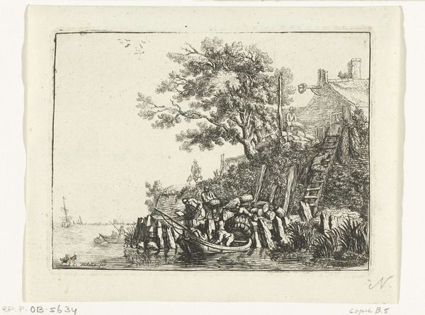 Johannes Arnoldus Boland created this print, “View of a Village on a River,” using etching techniques. The composition invites you into a serene yet detailed world, where the textures of water, foliage, and architecture merge to create a harmonious scene. Boland masterfully uses line and tone to construct depth. Notice how the intricate cross-hatching defines the cloudy sky and the rippling water, giving them a palpable sense of movement. The strategic placement of dark and light areas guides the eye from the bustling riverbank to the tranquil village nestled among trees. The structure of the image balances human activity with natural elements, suggesting a symbiotic relationship. The church spire, subtly placed, anchors the village and perhaps implies a moral or spiritual center. Yet, it's the textures and meticulously rendered details that truly capture the essence of this tranquil scene, inviting you to contemplate the interplay between nature, culture, and human presence. This etching offers a window into a world where every stroke contributes to a larger, cohesive vision.