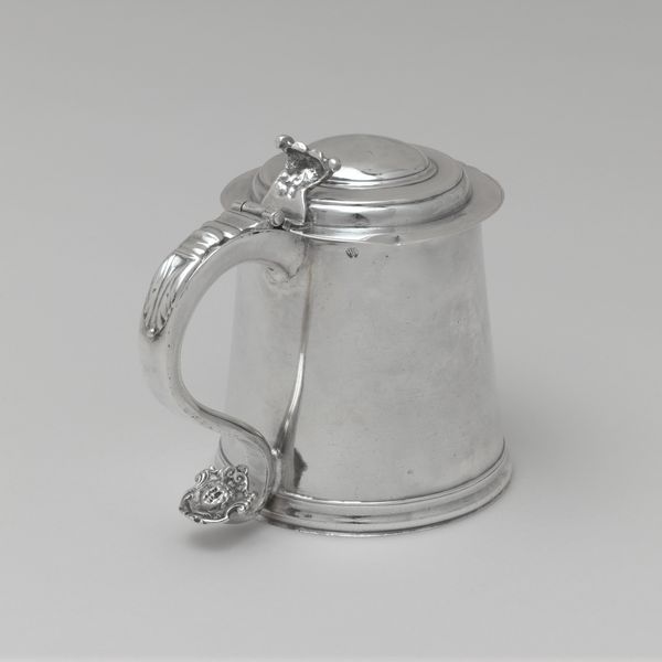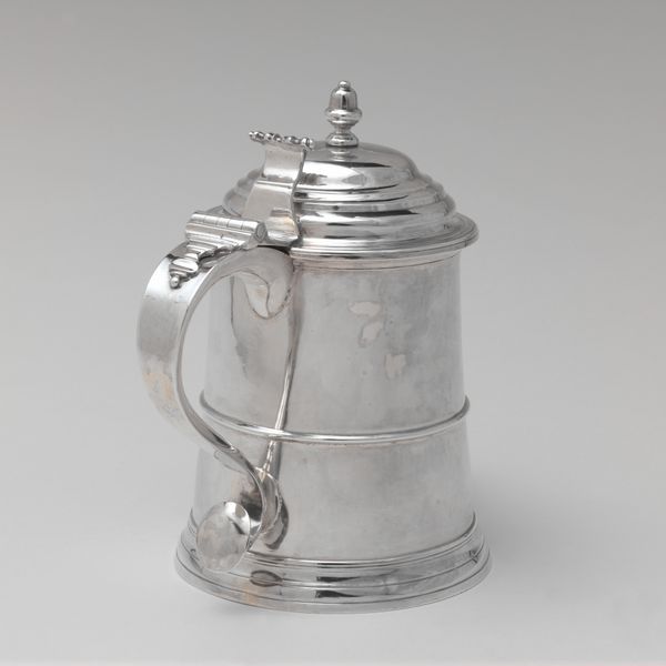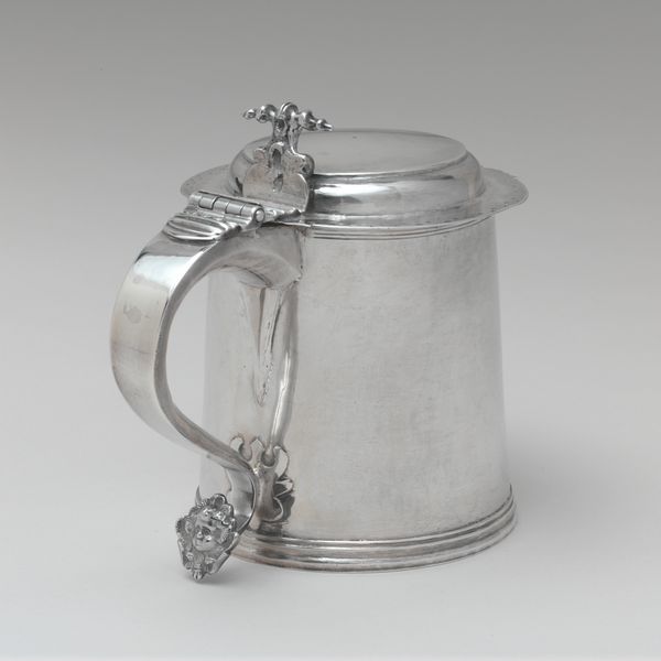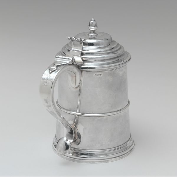 This Tankard was crafted in silver by Benjamin Burt in the 18th century, embodying the spirit and craftsmanship of colonial America. Note the finial atop the lid. It's a twisted, flame-like ornament. It's reminiscent of the classical acanthus leaf and other stylized botanical motifs, symbols that have been used across cultures and religions throughout history. These symbols, like flames reaching skyward or plants growing upwards, can be found in ancient Greek architecture and Renaissance paintings. Consider the association of these shapes to natural, organic forms. Recall that flames represent transformation, plants evoke growth, and each are an eternal cycle of death and rebirth. These symbols are not merely decorative; they are a connection to fundamental human experiences. This tankard, therefore, serves as a vessel for reflection, inviting us to delve into the subconscious and explore the deeper meanings embedded within the objects that surround us, revealing how symbols evolve and carry cultural memory across time.