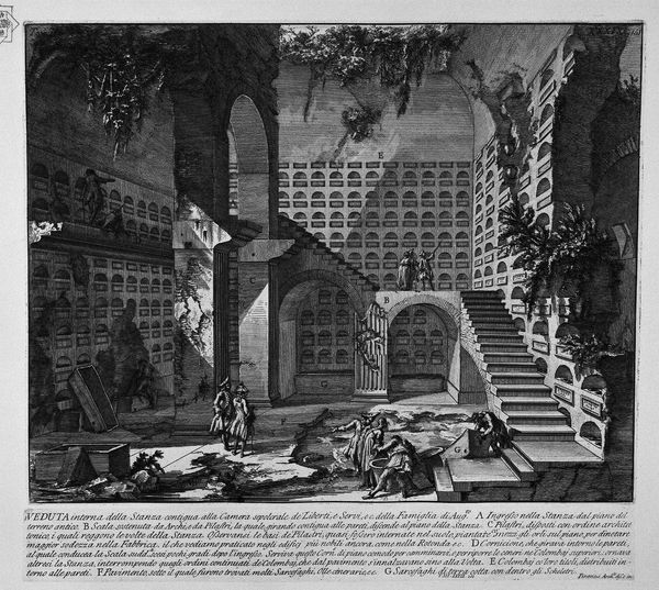 Giovanni Battista Piranesi created this etching of Trajan's Market, part of his series on Roman antiquities. The print is dominated by the stark contrast of light and shadow, a technique that enhances the monumentality and depth of the architectural forms. The repetitive arches create a rhythmic visual pattern, guiding the eye along the curving facade of the market. Piranesi uses the etching medium to explore themes of decay and the sublime. Note how the contrast between the detailed rendering of the ancient structure and the ruinous state in which he presents it creates a dramatic tension. This tension highlights the transience of human achievement and the enduring power of time. The formal structure of the print, with its strong lines and chiaroscuro effects, evokes a sense of awe and melancholy, inviting reflection on the layers of history embedded in Rome's urban landscape. The arrangement of space and perspective in the print further destabilizes any fixed reading, emphasizing instead the fluid and ever-changing relationship between past and present.