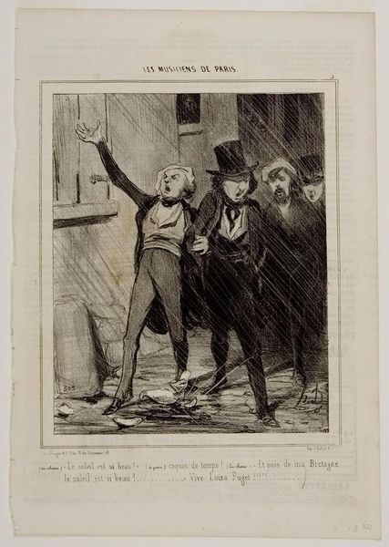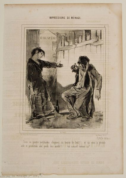Curator: This lithograph, "The Coal-man Loves to Be (Is Master) in His Own Home" is by Honoré Daumier. Editor: There’s something about the starkness of the lines that conveys such a sense of the everyday drudgery. The figures are so raw. Curator: Indeed. Consider the historical context: Daumier used his art as social commentary, critiquing the bourgeoisie and championing the working class. Editor: You can almost feel the weight of the coal-man's labor. The interplay of light and shadow defines the figures. The glass, the body language, it says much about the relationship these men have to alcohol, class, and refuge. Curator: Exactly. It makes you think about class, identity, and what it means to have power—or to seek escape from its lack. Editor: The composition and the starkness work together to create a visually powerful image. Curator: It is a reminder of how art can serve as both mirror and lens, reflecting and refracting the realities of society. Editor: Agreed. There’s a certain poignancy to it, still relevant today.