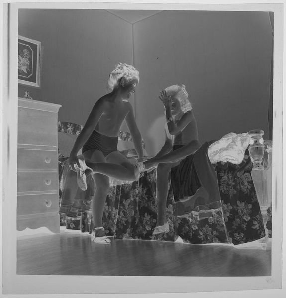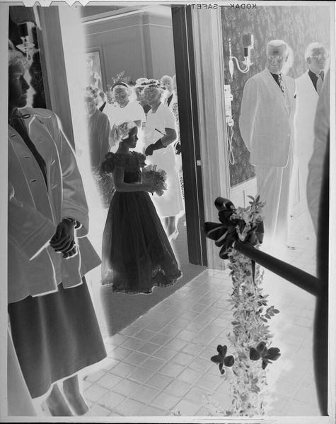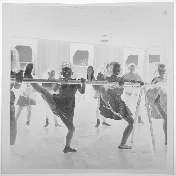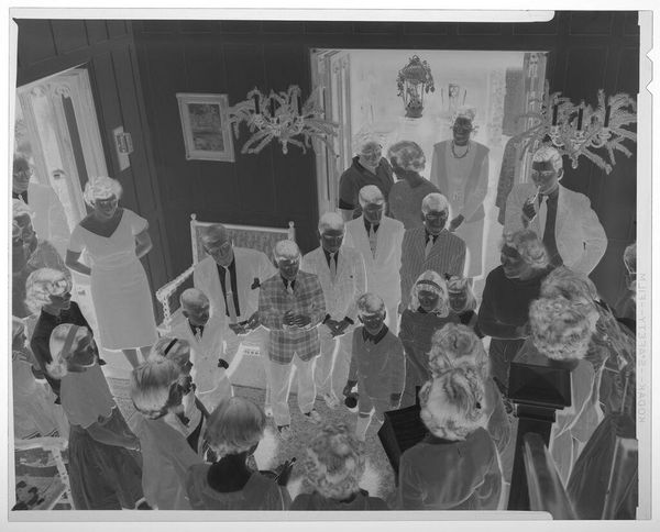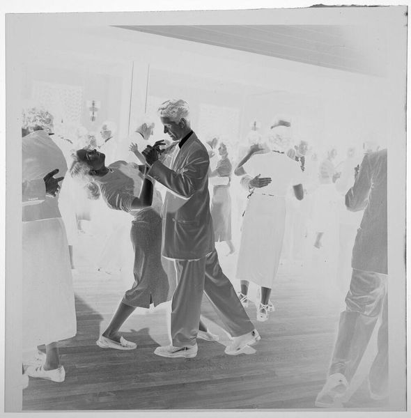 Curator: At Harvard, we have an untitled photograph by Jack Gould, simply called "several couples dancing." It's a small, intimate shot. Editor: It feels spectral, like a memory half-remembered. The reversal of light adds this strange weight to the scene. All these bodies and no faces... Curator: The image shows couples in motion. There's a sense of unity and belonging, perhaps even of joy. The dark and bright values might represent the passage of time. Editor: I'm reminded of memento mori, that awareness of mortality in dance. Yet, there's a tenderness in how they hold each other. Curator: Yes, the symbol of dance and love intertwined. Gould makes us think about connection, even in the face of uncertainty. Editor: A quiet invitation to embrace the moment. I appreciate that.