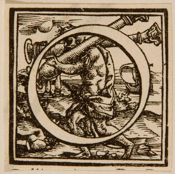 Curator: Here we see the woodcut "Letter G," an intriguing anonymous work. What strikes you first about its composition? Editor: The stark contrasts create a dramatic tension; the letter's form is both graphic and sculptural, framing a scene of ambiguous labor. Curator: Indeed. Notice how the figures—one seemingly demonic, the other perhaps angelic—are actively engaged in what appears to be a collaborative act of creation, set against a horizon of human industry. Editor: The cross-hatching is quite dense, giving volume to the figures and depth to the ground. Is this suggestive of a moral narrative, perhaps concerning labor and temptation? Curator: Precisely. The ambiguity in the figures reflects broader societal anxieties about power, gender, and the negotiation of moral boundaries within the burgeoning print culture. Editor: This interplay—the graphic boldness against the intricate detail—invites further analysis. Curator: Absolutely, it prompts us to consider the work's function within systems of knowledge and social control. Editor: This close look reveals a complex interplay of form and potential meaning. Curator: It makes you think about who has the power to define such terms and their impact on society.