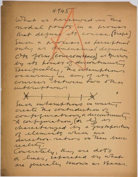 Curator: This handwritten page, "Art Theory Text with Types A and B Configuration Diagrams," from 1943 by Stuart Davis, is like a peek into the artist's mind. It's a fascinating jumble of text and diagrams on paper. Editor: I’m struck by how raw and immediate it feels, almost like a stream of consciousness. What do you make of Davis's "types" and "configurations"? Curator: I think he's attempting to dissect and codify the underlying structures that give rise to visual harmony, like a musician deconstructing a melody. It's a lovely thought, don’t you think? Editor: Absolutely, it gives new meaning to his colorful paintings. Thanks for sharing your perspective. Curator: My pleasure. It's always a joy to see these intimate glimpses into an artist's creative process.