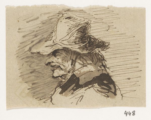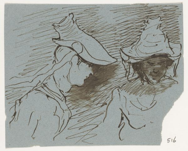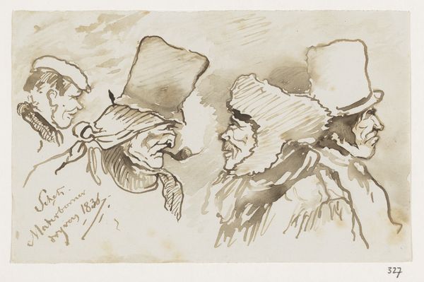 Editor: Okay, next up we have “Drie figuren,” or “Three Figures,” by Johannes Tavenraat, made with ink sometime between 1870 and 1874. The drawing has a real energy to it, almost like a quick sketch capturing a fleeting moment. What catches your eye in this piece? Curator: Well, it *does* feel incredibly spontaneous, doesn’t it? Like a visual diary entry. Tavenraat's choice of ink, so raw and unforgiving, really lends itself to that impression. Notice how the hats become these almost comical extensions of their personalities. Makes you wonder what kind of social scene he was trying to evoke…almost a bit like a Rembrandt on caffeine! What kind of story do *you* imagine is unfolding here? Editor: That's a great point about the hats. I guess they seem almost caricaturish, which adds to the sense of it being a snapshot of everyday life, maybe a bit satirized. I was focused on the textures, the roughness of the ink strokes that feel modern somehow. I think it makes me wonder, were the caricatures considered cutting edge back then? Curator: Exactly! He was capturing a certain kind of person, a certain attitude perhaps. It does remind us to question assumptions, doesn’t it? That directness, that slightly unflattering portrayal, is pretty powerful stuff. How does this affect your interpretation of Tavenraat as an artist? Do you see him as observational, or is there a judgmental element at play? Editor: Hmmm. That really makes me think about his intention, if he’s more observant or critical. It's tough to say for sure, isn’t it? This definitely gives me a fresh view of this drawing; the figures almost seem less like subjects, more like active participants in some untold tale. Curator: And there it is. The beauty, isn't it? Art’s endless invitation for storytelling, with us right in the centre of it. Editor: Totally. So much for a simple drawing; turns out it’s more of a novel!