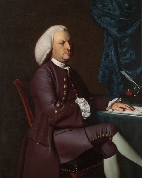 Curator: Standing before us is Robert Feke's portrait of Ralph Inman. The painting, now residing at the Harvard Art Museums, captures Inman in a moment of poised affluence. Editor: It’s interesting how the artist emphasizes the stark contrast of textures, like the stiff formality of the ruffled cuffs against the soft drape of his jacket. Curator: Indeed, the portrait’s symbolism is rich. The carefully chosen attire denotes Inman’s status, while his composed gaze suggests confidence and authority within his social sphere. Editor: Beyond status, don't you feel there's a hint of vulnerability in the set of his jaw, a fleeting shadow that hints at humanity beyond the outward projection? Curator: Perhaps. Either way, Feke's ability to capture both the man and the cultural symbols of his time is remarkable. Editor: I agree; analyzing its composition, symbolism, and even its material elements has expanded my understanding of this work. Curator: Likewise, tracing those symbols reveals layers of meaning that enhance our experience and connection with the past.