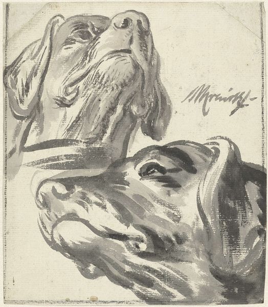 Editor: This drawing by Peter Paul Rubens, called "Heads and necks of two bovines; portion of neck of a third," appears to be an engraving. The linear quality makes me think of scientific illustration, yet the animals' expressions feel so individualized, so alive. What do you see in this piece? Curator: It's a fascinating work, isn’t it? On the surface, it’s an anatomical study, fitting into a broader historical context where scientific inquiry and artistic representation were intertwined. But let’s delve deeper. Consider Rubens’s time, the 17th century, rife with religious and political upheaval. What might the choice of bovines, animals often associated with labor, sacrifice, and even docility, signify in such a tumultuous period? Editor: That's interesting. So, are you suggesting these aren’t just studies of animal anatomy, but maybe… commentaries on the social order? The burdens people carried? Curator: Precisely! Look at the detail given to their eyes. They possess a kind of weary knowing, don't they? This engraving could be viewed as part of a larger visual dialogue questioning power structures and societal expectations, echoing similar sentiments found in contemporary philosophy and early feminist writings. The artist uses seemingly simple subjects to raise more complicated conversations on labor, obedience and society's expectations. Editor: Wow, I hadn't considered that. So even a drawing of farm animals can be politically charged? Curator: Absolutely. Art doesn't exist in a vacuum. By examining its historical, social, and philosophical context, we unlock layers of meaning and gain a richer understanding, opening it to fresh interpretations through our contemporary lens. What do you think? Editor: I'm definitely seeing it differently now. It's a reminder to look beyond the surface and consider the deeper narratives at play. Thank you. Curator: And thank you for opening up to new perspectives. It is crucial to approach art not just as aesthetic objects, but as reflections of complex social realities and tools of silent protest.