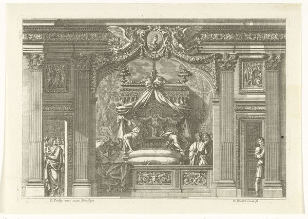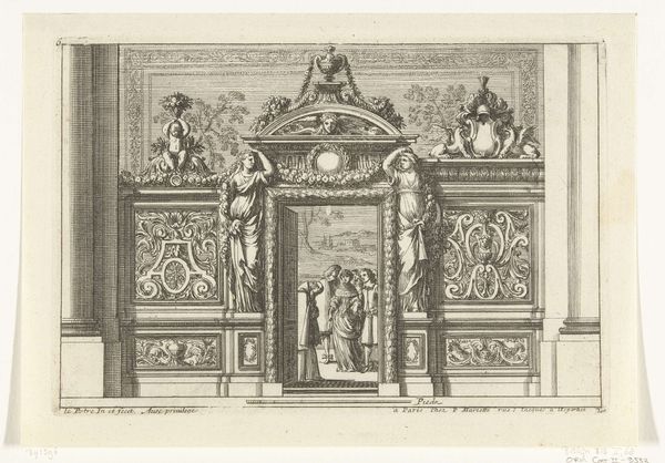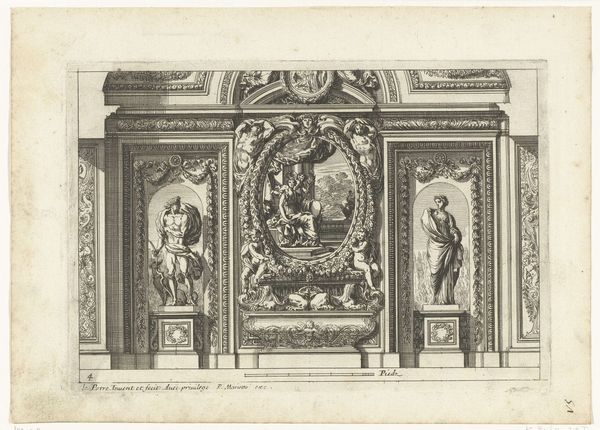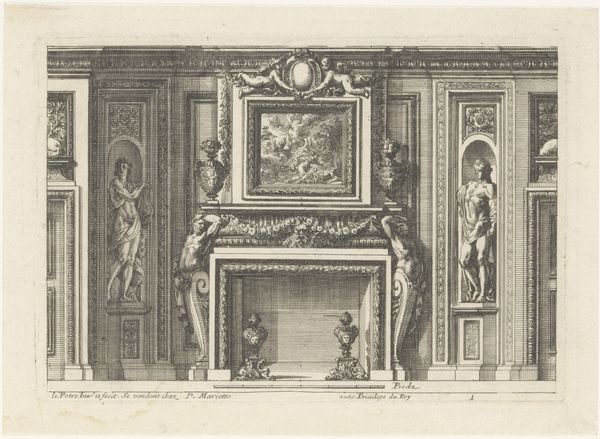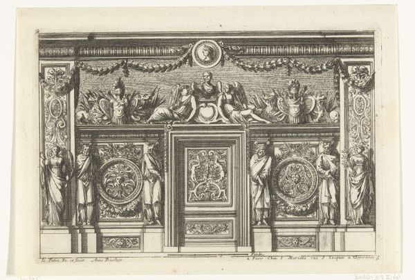 Editor: So, this is “Schouw met keizersbuste,” a print etching and engraving by Jean Lepautre, dating from around 1658 to 1670. It depicts a very ornate fireplace. The level of detail is just incredible, so extravagant! How do we even begin to interpret a piece like this? Curator: It's a fantastic example of the Baroque era’s embrace of elaborate ornamentation and its use in shaping political and social spaces. The fireplace, far beyond a functional object, becomes a statement. Consider its placement: central to the room, visually asserting power. What message do you think that bust of the emperor is sending? Editor: Definitely power, right? Authority, grandeur… it's literally putting the emperor in the center of the home, maybe as a symbolic endorsement? But who was this design intended for? Was it just for royalty, or...? Curator: Not necessarily just for royalty. While royal courts certainly popularized these aesthetics, the rising merchant class also used such designs to emulate power and status. This print itself facilitated the dissemination of such styles. Imagine, you could purchase this design and then commission artisans to create a similar fireplace for your own home. Did the "originality" matter? Editor: Wow, so it’s not just about individual artistry, but about the cultural influence these designs could exert. So prints like this democratized luxury in a way? They set trends. Curator: Exactly! They allowed a broader segment of society to participate in visual culture. And, crucially, this participation shaped the broader political and social landscape, influencing how power was perceived and emulated. A silent propaganda. Editor: That really changes how I see decorative art. I’m now thinking of design not just as beautiful but also as actively participating in cultural and political dialogues. Curator: And that's exactly why these works are so important for us to study, and understand the role of images and objects.