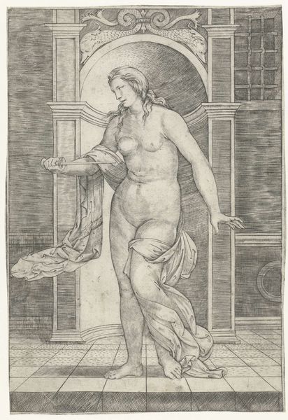 Editor: We are looking at "Riviernimf Styx" or "River nymph Styx," an engraving by Philips Galle from 1587. It depicts a nude female figure next to a body of water, and she seems to be emerging from a rather large seashell. I'm immediately struck by how imposing and almost masculine she appears, despite being a nymph. What can you tell me about this piece? Curator: It is interesting that you noticed the figure's muscularity. Consider the political climate of the late 16th century, especially within the Habsburg Netherlands, where Galle worked. The "nymph" Styx is not merely a decorative female nude. Here, the allegorical nude embodies power, and perhaps more specifically, dominion. Consider that Styx is a deity related to one of the rivers of the Underworld and a key figure in oaths and boundaries. This connects to the period's emphasis on authority and the control over geographical space, reflecting the intense socio-political struggles playing out in that historical period. Does this reading resonate with your initial reaction? Editor: It does. Knowing the history behind the work provides a new way of seeing its meaning. I would not have associated her figure with political struggle, otherwise. Curator: Furthermore, notice how Galle's use of engraving amplifies the texture of the scene. The calculated arrangement of lines, the hatching, contributes to the overall somber, assertive mood of the image, drawing the viewer into the realm of both myth and political reality. What is more prominent, her sexuality or power? Editor: Definitely her power. The knowledge of the historic setting reshapes one's reception of this work of art. I now interpret Styx’s figure as more commanding and her nudity, perhaps, as more of an allusion to some ancient authority than some titillating display. Thank you. Curator: Indeed. Examining art through a historical and cultural lens opens us to complex interpretations, and I appreciate you considering those nuances with me today.