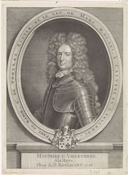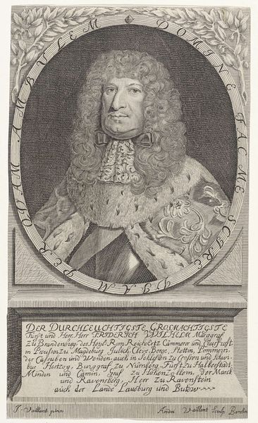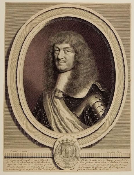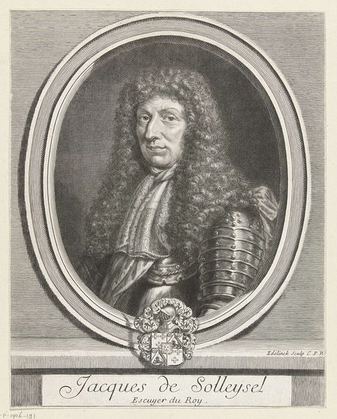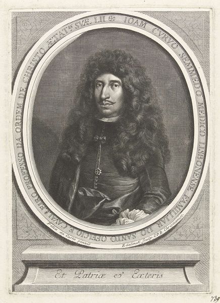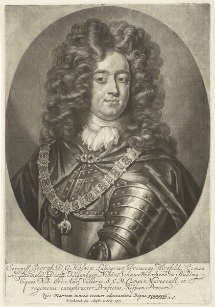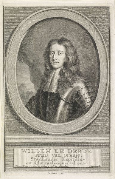 Curator: Welcome. We’re looking at a 17th-century engraving, "Portret van Vincentio Rospigliosi." It was produced sometime between 1646 and 1679 by Albertus Clouwet. Editor: It strikes me as meticulously detailed, yet strangely melancholic. The fine lines of the engraving lend an almost ethereal quality, softening the armor in a surprising way. Curator: It’s a classic baroque portrait. Notice the elaborate framing, with its decorative elements, like the diamond motifs—perhaps indicative of status. The text below the portrait lends significance as well, pointing to Vincentio's military associations and suggesting some connection to the ecclesiastical state. Editor: The intricate details of his lace collar against the hardness of his armor offer a captivating contrast. Is he being portrayed as both a warrior and a man of sophistication? I wonder how intentional that was. The artist also used different densities of line to build form, light, and shadow. Note, especially, the textural depth in his cascading wig, offset against his somber expression. Curator: Baroque art certainly reveled in contrasting elements. The armor, an immediately recognizable symbol of military power, alludes to protection and strength. But paired with the delicate lace and voluminous wig—signifiers of wealth and refinement—we get a portrait that speaks to the complex societal roles a man like Rospigliosi would occupy. It represents, visually, both strength and privilege, intertwining those notions in a powerful statement about status. Editor: What truly draws me in, however, is Rospigliosi's gaze. He doesn't exude the confident swagger one might expect from a man in armor. Instead, he possesses an air of pensiveness, almost vulnerability. His eyes feel direct, piercing—laden with the weight of history, perhaps? The engraving perfectly captures that interiority, which moves past a surface-level depiction of wealth or social standing. Curator: A worthwhile point. The artist truly seems to capture something more than just social posturing, something universally, enduringly human. Editor: Indeed. I initially perceived melancholy, but, perhaps, now I'd refine it to quiet contemplation in the face of power. Curator: I find that reflection particularly insightful after looking more deeply.