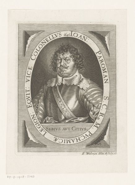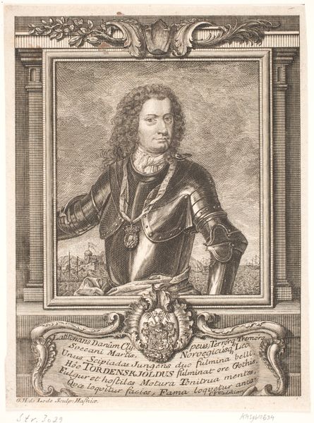 Editor: Ah, here we have "Portret van Alphonse de Berghes," a rather formal engraving created sometime between 1710 and 1725 by Jan Baptist Jongelinx. Curator: Well, hello there, your Grace! My first thought? Intriguing. He's got that sly little smile like he knows all the secrets, doesn’t he? Editor: He certainly presents a figure of authority, framed within that elegant oval and elaborate base. Look closely at the texture Jongelinx achieved. Engraving is such a fascinating process; labor-intensive and reliant on skill. Consider the paper too; handmade, laid paper, likely rag-based. Curator: The base almost makes it feel like a tiny monument, a paper altar to commemorate someone important, which I believe the Bishop was at that time in Belgium. Do you think the medium flattens his presence though? I’m sensing more archetype than an actual person. Editor: Flattening might be a limitation of the print medium, but the very nature of prints made such images more accessible. We are not looking at a unique portrait intended for a private collection. Consider how engravings were used to disseminate information and bolster political power. Copies made this image ubiquitous within the community, potentially shaping public perception of the Bishop. Curator: Power indeed! It feels almost like a baroque superhero portrait! "Defender of the Faith", engraved with ultimate finesse! There is also the inclusion of the Bishop’s Coat of Arms which also signifies status, and also suggests the idea of history and memory attached to a physical object which could itself become an emblem for future generations. Editor: Absolutely! This object connects so well to a study in circulation of images, the material conditions of production, and the shaping of social identities. We might easily forget to address these issues when simply looking at portraiture. Curator: True. You see the paper, I see the presence behind the image. It seems he truly looks back at us. I still feel, staring into the Bishop's slightly lopsided portrait that this print hints at deeper things and untold tales and the way Jan Baptist Jongelinx managed to capture this into a paper will still allow people to tell his tale! Editor: Indeed. By interrogating process, materiality, and historical context, we move beyond aesthetic appreciation to unpack the power dynamics embedded within this intriguing portrait.