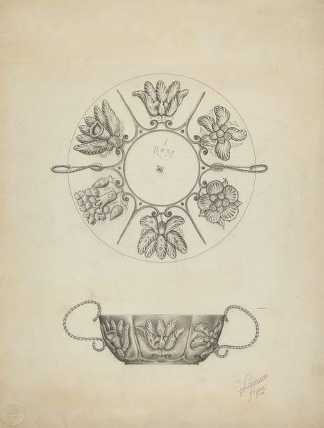 Editor: This is "Warming Pan," a 1937 watercolor and drawing by Dayton Brown. I find the geometric and floral elements within the circular form quite interesting, along with how the pan and its handle are separated. What compositional elements stand out to you? Curator: Note how Brown meticulously renders the textures and forms. The circular pan, with its embossed floral design, sits above a representation of its handle. Observe how line quality defines the different forms. The pan relies on contour, but with subtle gradations to define the roundness. Consider the handle below, rendered with very simple, nearly mechanical lines. Editor: So the drawing isn't just about representing the object, but more about the interplay of lines and forms? Curator: Precisely. Think of semiotics. The circle of the pan acts as a signifier—a symbol—for warmth, home. Note, too, that Brown separates pan and handle to explore these forms distinctly. Observe that tonal range and texture denote use, time, where flatter lines represent potential energy. It appears the object's use, in essence its past is, on full display. Editor: I see. So by isolating and detailing these elements, the artist is communicating the essence of warmth through geometric forms and texture? Curator: Indeed. It asks us to engage with form, line, and color independently and in unison. Through careful consideration, the warming pan moves beyond the functional into the space of abstraction and formal contemplation. Editor: It’s interesting how a functional object becomes this exercise in lines, colors and textures. I didn't expect that. Curator: Considering art's basic elements often makes it more exciting than we originally thought.