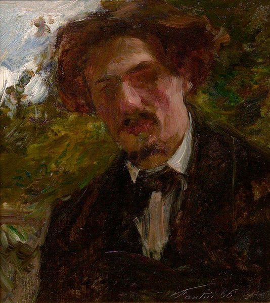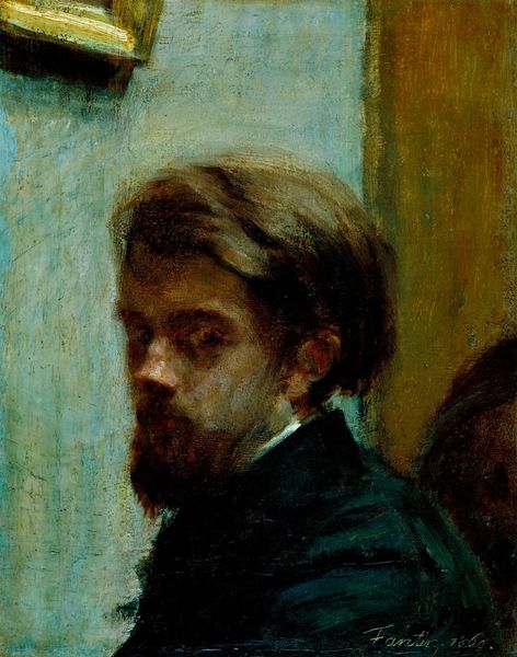 Editor: This is Henri Fantin-Latour’s "Self Portrait," painted in 1861 using oil on canvas. I’m struck by its somber tone, the artist’s downcast gaze, and the seemingly unfinished quality of the background. What formal qualities stand out to you in this piece? Curator: The tension between finish and incompleteness certainly commands attention. Observe how Fantin-Latour meticulously renders the face and hair, creating a tactile sense of volume and texture. Consider how the darker, more expressive brushstrokes defining his coat create a contrasting effect. Editor: Yes, the coat seems to almost dissolve into the background, pulling my focus to his face. Is that contrast deliberate? Curator: Precisely. Notice also the restricted palette—primarily browns and creams, which further isolates the head and upper torso. The use of light directs the viewer's focus, establishing a visual hierarchy within the composition. Consider the geometric arrangement; it's far from arbitrary. Do you notice how the slope of the hair echoes the angle of his shoulders? Editor: That's an interesting observation, I see the correlation you’re pointing to. Are you implying there’s some symbolic intention in the way he composed himself in the painting? Curator: It's the structural relationship I'm indicating, yes. The structural unity enhances the overall impact. Consider too the rough texture. This isn’t illusionism; the visible brushstrokes are key. This allows us to read beyond surface appearances. How do you interpret this? Editor: I'd say the texture emphasizes materiality and process, moving away from simply mimicking reality. I can also better understand the structural elements here. Curator: Indeed, the raw texture serves to accentuate the artist's self-awareness in the act of painting. Editor: Thank you. Now, when I look at this self-portrait, I'm noticing more clearly that his gaze is not simply “downcast”.