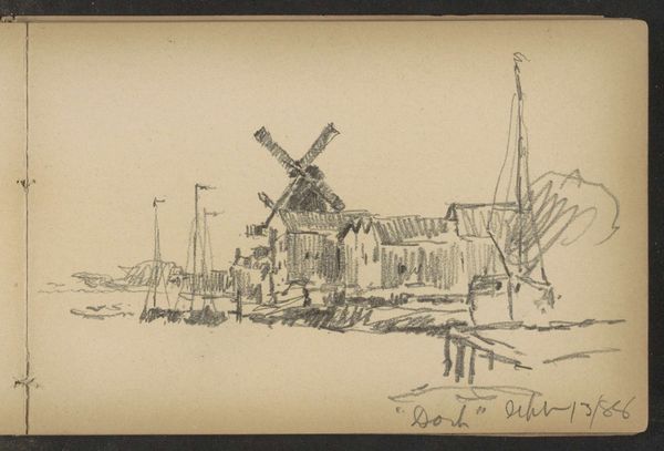 Alexander Shilling sketched this waterside landscape with pencil, capturing a Dutch windmill and surrounding houses. The windmill, a dominant symbol here, transcends its functional role. It evokes a sense of persistence. Similar to how the wheel symbolizes the cyclical nature of life across cultures, from ancient Mesopotamian art to Buddhist mandalas, the windmill’s turning blades reflect time’s relentless passage and the endurance of human endeavor. Windmills harness nature's power, mirroring humanity's long-standing ambition to control and utilize the environment, a theme echoed in countless mythologies and technological advancements throughout history. The image creates a subconscious connection to our shared cultural memory. This landscape is not just a scene, but a potent symbol of the human spirit.
