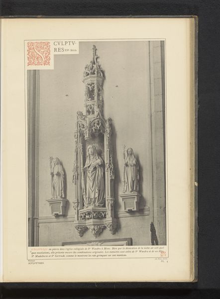 Editor: Here we have an image of the black marble altarpiece located in the Sint-Waltrudiskerk in Mons, Belgium, dating back to before 1887. The relief sculptures contrast starkly against the dark marble. What are your thoughts on the composition? Curator: Note the emphatic verticality. The architectonics structure of stacked tiers is reinforced by a rhythm of pilasters and sculptural panels. The relationship of base to capital within the pilaster structures is of interest. Are the figural representations strictly contained by architectural form, or is there an intentional breaching? Editor: It seems they’re intentionally integrated. Do you think this impacts the overall harmony? Curator: Harmony is perhaps too simplistic a reading. Note the stark contrast between the cool, austere marble and the dynamic, almost frantic, energy of the figures. This dissonance prevents sentimentality and instead invites an inquiry into structure. How do you read the positioning and scaling of figures within each panel? Editor: Some figures seem more prominent. Curator: Indeed. It creates a hierarchy that directs the viewer's gaze, shaping narrative flow. Notice how light and shadow play across the sculpted surfaces, articulating the figures and adding depth. The architect utilizes high-contrast monochrome to achieve a certain legibility to narrative that would not necessarily hold in fully polychrome form. Editor: So the success relies not just on the sculpting but also on the light interacting with it? Curator: Precisely. Without the carefully orchestrated play of light, the formal relationships would become less clear, impacting the overall visual impact and interpretation. I would enjoy the chance to spend an hour meditating in the presence of this. Editor: I hadn't considered the light's role so thoroughly before. It makes me want to view it in person! Curator: Indeed. And for myself I wish to now consider the narrative construction. Is there an inherent tension between the narrative structure and the support thereof?