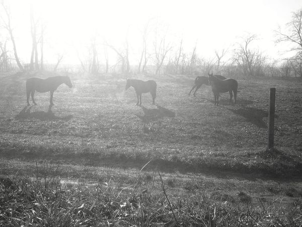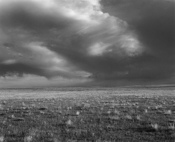 Curator: Alfred Freddy Krupa took this arresting gelatin-silver print, titled "Horses rest," in 2018. The setting feels rural. Editor: It does. I immediately feel this melancholic stillness. The monochrome palette is stark but beautiful, giving the horses a statuesque presence against that ominous sky. It's the kind of scene where you can almost feel the dampness in the air, hear the soft breaths of the horses, smell earth... You know, if you were there, which sadly we aren't. Curator: Gelatin-silver prints were common in the 20th century for their sharpness and tonal range, and I think Krupa leverages both here to amplify the feeling. It’s interesting how a photographic choice roots the scene in a very specific time, while the horses themselves seem timeless, almost archetypal. The history of horse-and-rider imagery stretches back to antiquity. Editor: True. And I think the setting helps – those stark, skeletal trees contribute to that agelessness. They stand there with the horses in this quiet conspiracy. I wonder what they're thinking. What it means to be a horse just... existing. We so often portray horses in motion, powerful and free. But here? Just gentle repose, against oblivion! Cheerful! Curator: Well, the artist has given us a study of domesticated animals that would otherwise exist with people. Editor: I think the horses serve as the primary focal point. Curator: They do stand in the immediate foreground of the work. They’re set against that atmospheric background which makes their dark forms prominent. Photography is used as evidence in our world, for photojournalism, art, memory, evidence. These images also reflect the sociopolitical views in which they were produced, but as a counter-point, Krupa creates this rather universal moment here. Editor: Yes, even though Krupa used such a historically laden technique, I am transported into their quiet moment of just “horseness.” The world seems quiet. It beckons... or is it warning? Who knows, but these steeds do not seem to mind at all! Curator: Thank you, indeed, these were my thoughts precisely!