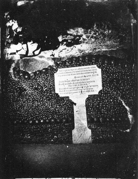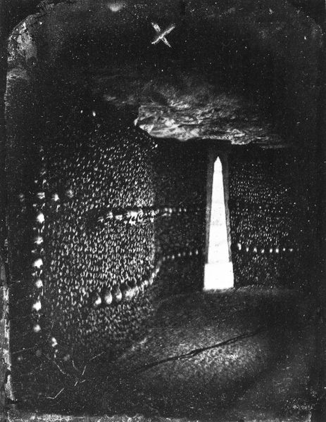 Editor: Nadar’s "Catacombes De Paris," a gelatin-silver print from 1861, gives such an eerie feeling. All those skulls! The contrast between the light and shadows is so stark. What’s your interpretation of this subterranean scene? Curator: The image resonates deeply within the cultural anxieties of 19th-century Paris. The Catacombs, a relocated burial site due to overflowing cemeteries, became a spectacle, a macabre tourist destination. Nadar, through his photography, wasn't merely documenting, but engaging in the evolving public discourse about death, sanitation, and urban space. What do you think about how this differs from earlier depictions of death? Editor: I see what you mean! It’s not a glorious battlefield or a religious scene; it’s almost like an… inventory? Curator: Precisely. This challenges Romanticism’s idealized visions. The "Catacombes" also points to the rise of photography's documentary role, shaped by the Second Empire's need for control and knowledge of its territory. And the Catacombs themselves became almost a political stage, hosting events. Did this image find an audience? Editor: Given that it was the early days of photography, who was this even shown to, and how? Curator: Think of illustrated journals, scientific publications, even art exhibitions, though photography struggled for artistic acceptance at the time. And it fed the bourgeois fascination with the city's underbelly, both literally and figuratively. The politics of imagery played a big part, highlighting government interest in controlling death and social order, which, let’s not forget, was soon after the French revolution. Editor: That completely reframes how I see the image. I wasn't really thinking about that relationship to documentation, control and spectatorship. Curator: Right, context shifts our understanding, allowing a deeper reading into how social, cultural, and even institutional frameworks influence our interpretations of art.