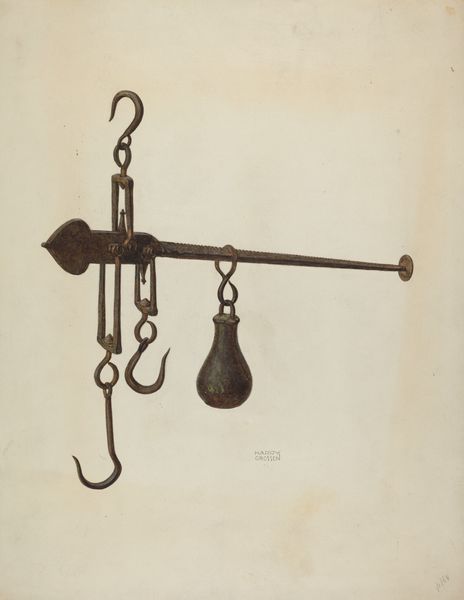 Curator: Frank M. Keane created "Steel Yard" around 1939, employing watercolor to render this measuring tool. What's your initial impression? Editor: A stillness. And such aged materiality rendered by the watercolor medium—there is a rustic starkness to this utilitarian object divorced from its labour context. It really brings focus to its physicality. Curator: I agree; the technique allows the grain of the steel yard to truly shine through, doesn't it? The use of watercolor underscores the object’s relationship to processes of measurement and production in a pre-digital age, reflecting on human endeavor within the scale of material labor. Editor: Absolutely. I wonder what statement Keane sought to make regarding the identity of labor in that era. Given the weightiness the object held, this instrument, almost a character study, provides narrative depth and questions what, or more accurately *who* defines economic value and production within industry. Curator: Indeed. Consider also the cultural narrative—such tools embody the hands of artisans and trade laborers, linking human interaction with daily sustenance. Was Keane positioning them with greater socioeconomic considerations and worth? Editor: That's quite compelling, isn’t it? The intersection between industrial function, hand craftsmanship, and ultimately its effects on lived experience... How else might our current perception change by acknowledging it as part of an era heavily affected by race, gender, and socioeconomic barriers? Curator: Interesting point... by isolating an object like the "Steel Yard" and elevating its aesthetic presence with a sensitive medium like watercolor, Keane draws attention to these unsung contributors. Editor: Precisely. Looking at this watercolor, I appreciate even more keenly its symbolic value as an icon of untold industry, of all the hidden social tensions and historical labour relations implicit in simple measurements. Curator: I'll remember those tensions the next time I buy steel or maybe even groceries, considering where goods come from and who weighed and valued them first. Editor: Absolutely. We are left with a unique blend of medium, tool and method that offers compelling visual analysis.