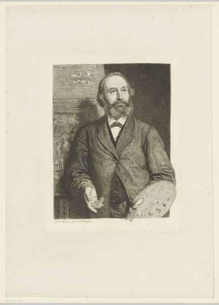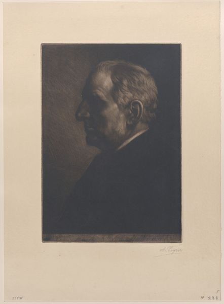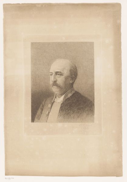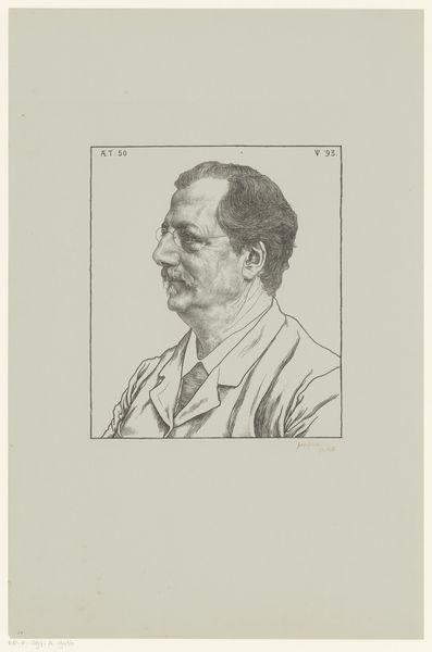 Editor: This is Jan Veth's pencil portrait of Diederik Johannes Korteweg from 1906, here at the Rijksmuseum. I find the rendering style really captivating—it's incredibly precise. How would you interpret the artwork through a formal lens? Curator: Certainly. Immediately apparent is Veth's command of line and value to sculpt form. Notice the hatching and cross-hatching used to create subtle gradations of light and shadow, especially around the face. This painstaking technique imbues the subject with a palpable sense of volume. What is also of note is the crispness with which the artist depicts the sitter's coat against the very minimally detailed and comparatively ill-defined background. What compositional relationships can you observe there? Editor: That makes sense. I guess, I had not focused on that – to me it seems a choice to move the background to being 'merely suggested.' Curator: Indeed. Now, focusing on the line work further, consider the intentionality behind the density of lines used to define Korteweg's features. Note how they are much denser around the eyes and along the cheekbone. Editor: Ah, yes, you're right! It directs the eye and enhances the three-dimensionality. So, it is through contrast that our attention is driven to those spots... Curator: Precisely. Veth manipulates formal elements to achieve an aesthetic impact, prompting questions of representation and interpretation through his careful and conscious handling of form, value, and line. Editor: I see how isolating those individual aspects allows us to unpack all of that meaning. Thanks, that was so useful. Curator: My pleasure. A study in the art of drawing!